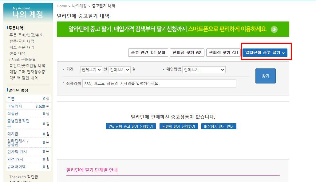 - 화면 중앙에서 우측 위 '알라딘에 중고팔기'를 클릭합니다.