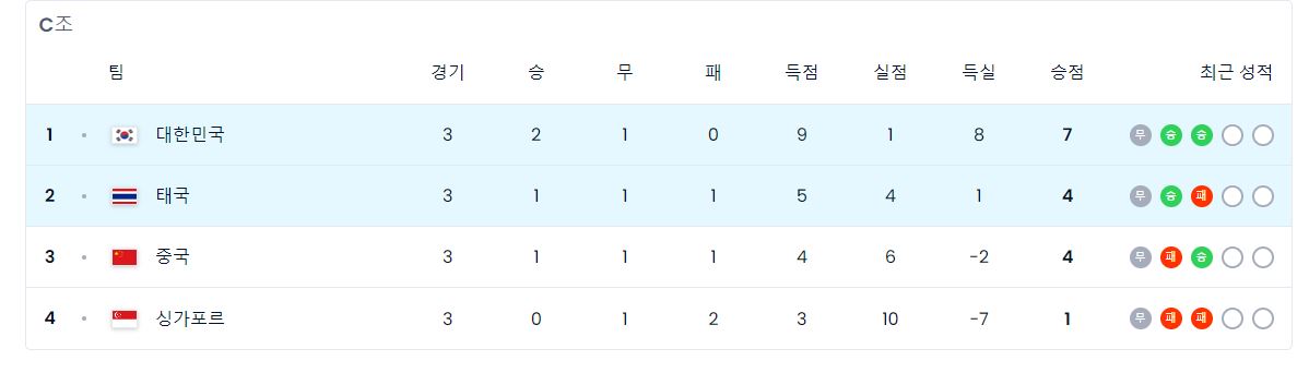 현재 C조에서 1위를 하고있는 한국인데요. 2등을 달리고 있는 태국과의 경기에서 이번 26일 경기에서 이기게 되면 최종예선 진출이 확정되게 됩니다. 저번 21일 태국과의 경기에서 무승부로 끝난 만큼 이번 경기에서는 꼭 우리 한국팀이 이겼으면 하는 바램입니다.