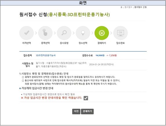실제 시험료가 14,500원일 경우 50%인 7,250원 결제