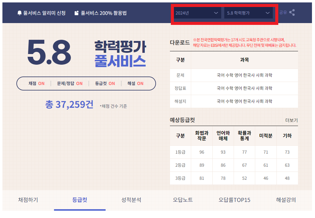 아래 버튼을 통해 들어가서 아래 빨간색 부분으로 표시된 곳의 토글을 내려 원하시는 모의고사의 등급을 확인하실 수 있습니다.