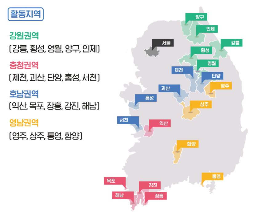 4대 권역 중 1개 권역 선택, 권역 내 희망지역 최대 3개까지 선택가능 선택지역 대상으로 [1단계, 자원조사과정] 진행 [2단계, 사업화과정] 진입시 1개 지역으로 최종선택하여 사업평가 및 사업진행 |
