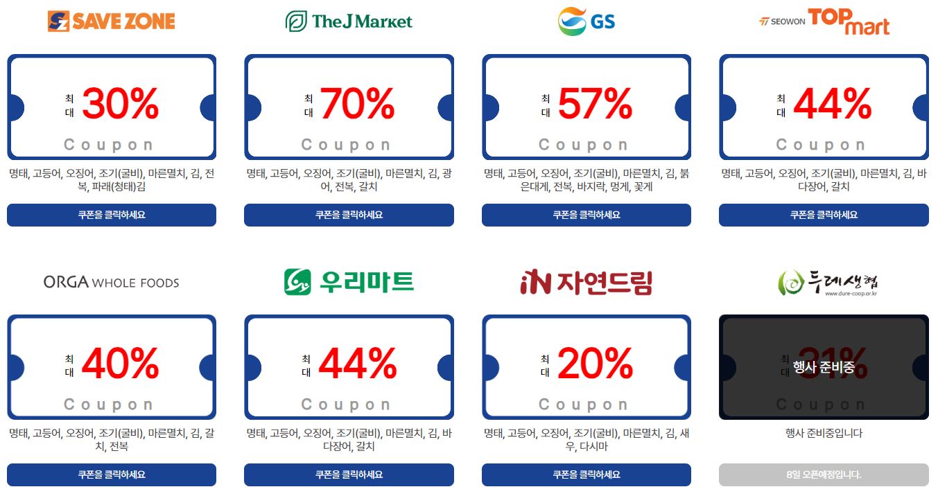 온라인 상품권과 오프라인 상품권을 수산대전 사이트에서 발급받을 수 있으며 온라인 최대 60%, 오프라인 최대 70%로 높은 할인률을 자랑하는 쿠폰들이 있지만 선착순 발급인 관계로 빠르게 쿠폰을 받으시는 걸 추천드려요.