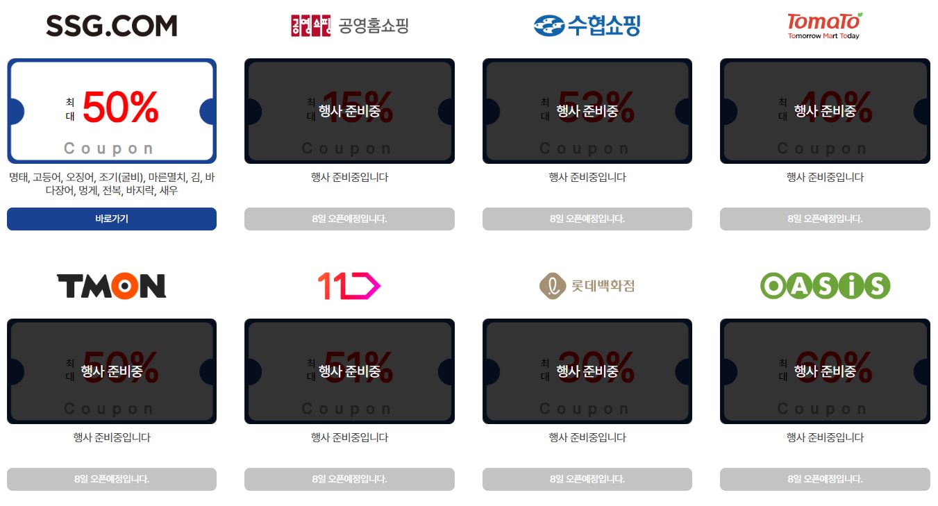 | 온라인 쇼핑몰 | SSG.COM, 공영홈쇼핑, 수협쇼핑, 토마토앱, 티몬, 11번가, 롯데백화점몰, 오아시스, 우아한형제들, 컬리, 카카오쇼핑, 농협몰, 쿠팡, AK몰, 비비수산, 캐시워크, 엔에스쇼핑, 훈훈수산, 위메프, 현대홈쇼핑, 제철장터, 우체국쇼핑, 에스케이몰, 내돈내산, 공유어장, 8도감, 지에스샵 |