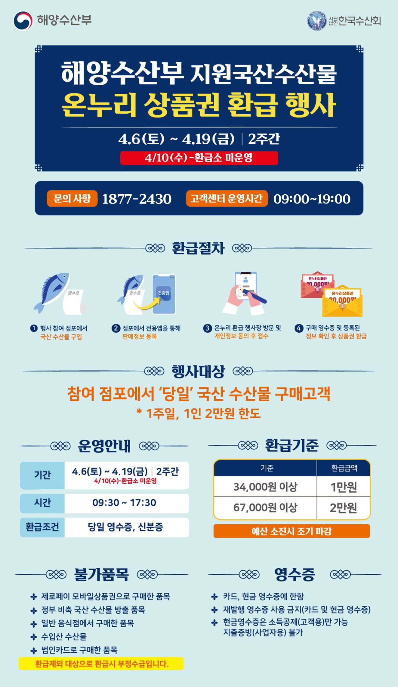 수산인의 날을 맞이하며 2024.04.04(목) ~ 04.21(일) 동안 행사를 진행하고 있으며 환급 행사 또한 4.6(토) ~ 4.19(금)까지 온누리 상품권으로 결제금액의 최대 30%를 환급해 줍니다.