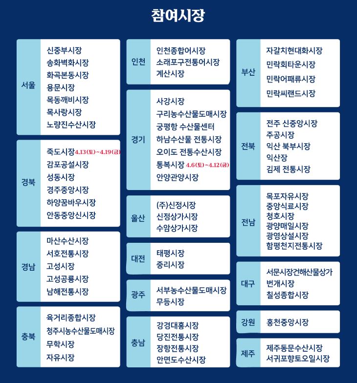 행사참여 전통시장에서 당일 구매한 국산 수산물 구매액의 최대 30%를 온누리 상품권으로 해주는 환급행사를 진행합니다.
